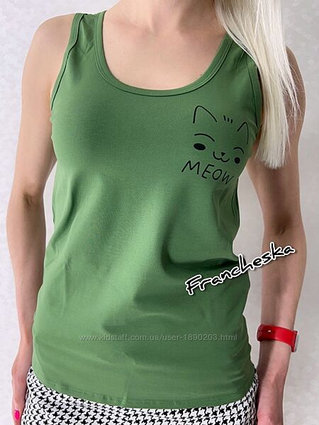 Домашній костюм жіночий майка і шорти з колекції "CATS" (арт.1637-16171) від українського виробника Roksana можна купити в нашому інтернет-магазині Francheska.Стильний та зручний комплект жіночий для дому та сну Roksana виконаний з якісного бавовняного полотна, складається з майки та шортиків середньої довжини. Однотонна майка приємного зеленого кольору, приталеного силуету на широких бретелях, зліва на грудях прикрашена принтом кота та написом "meow".