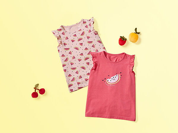 Бавовняні футболки бренду Lupilu. З круглим вирізом горловини та короткими рукавами з рюшами. Зручні завдяки високому вмісту бавовни. Оптимальна посадка завдяки еластану LYCRA®. Ecoprint – 100% екологічний друк на текстилі. Кількість 2 шт.Заміри: надаємо по запиту