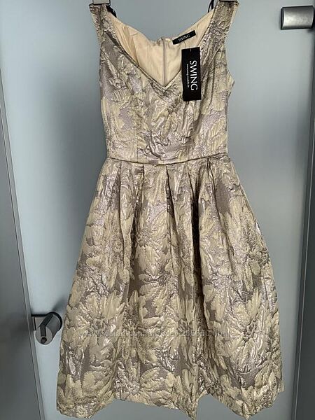 Вечернее коктейльное выпускное платье Swing, ткань с выбитым узором, с серо-золотым отливом,ориентируйтесь по замерам длина - 10 см верх — 38 см по груди - 45 см по талии - 34 7/3