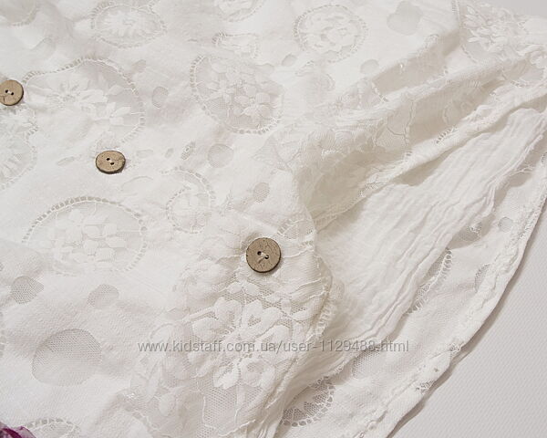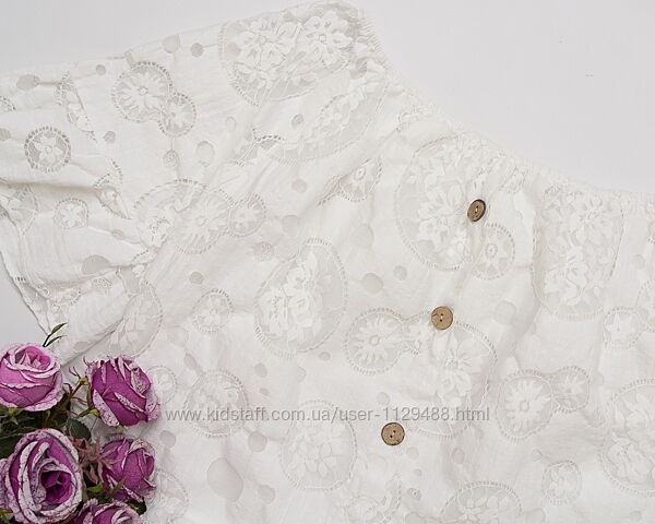 Нежная, необычная, заметная и эффектная. Выполнена из текстурной хлопковой ткани с невесомым прозрачным кружевом. Сделана грамотно, на подкладке из тончайшего хлопка, соответственно не жаркая и не просвечивает. Крой свободный, горловина присобрана на резиночку, рукава широкие с воланами--самая актуальная модель, спереди имитация застежки на крупные кокосовые пуговицы.