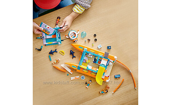 Пориньте у світ пригод разом із Lego Friends 41734 Морський рятувальний катамаран! Цей набір стане чудовим вибором для дітей від 7 років, які люблять природу та мріють про захист океанів. Конструктор включає деталізований катамаран-лабораторію та мініатюрний підводний човен, що дозволяє відтворювати реалістичні рятувальні місії. Маленькі дослідники можуть очищати воду від сміття, збирати зразки та сортувати відходи для переробки.Переваги