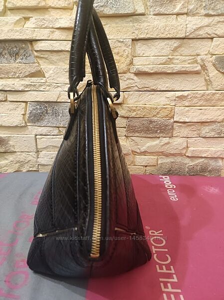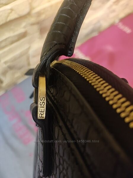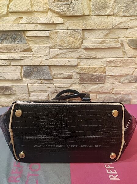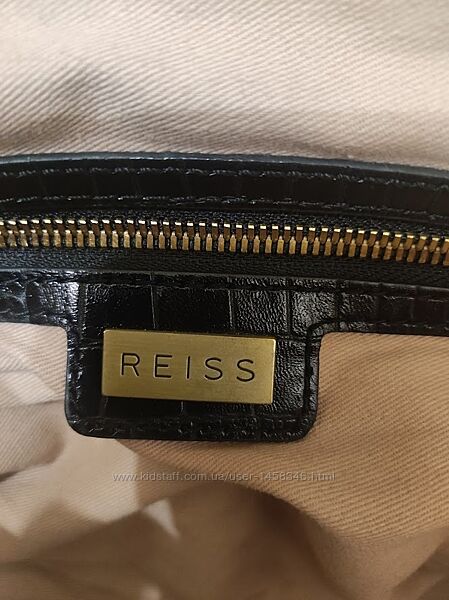 Чудова сумка англійського преміум бренду Reiss, із натуральної ,якісної шкіри, з тисненням під шкіру рептилій,оригінальний фасон,одне відділення, та бокові кишені ,розмір: довжина в найбільшій частині 39 см,висота 23 см,ширина дна 15 см,довжина ручок 38 см.