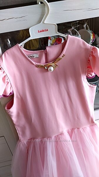 Сукня атласна святкова на дівчинку 8-10 років. Нова, з етикеткою.Красивого рожевого кольору. Декорована красивою брошкою з крупною перлиною. Низ пишний, кілька шарів фатину. В комплекті - піджачок, рукава декоровані перфорацією.