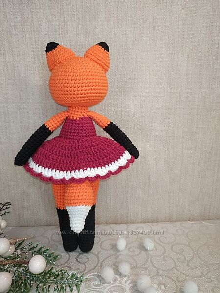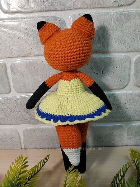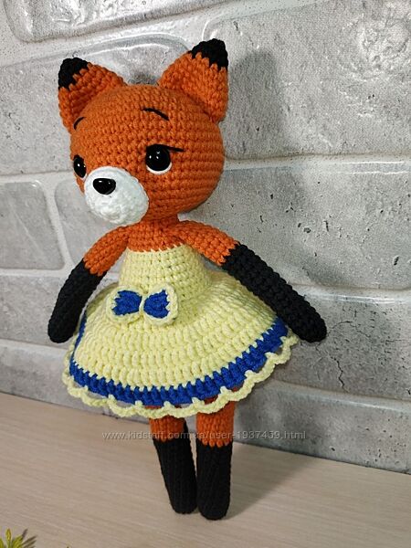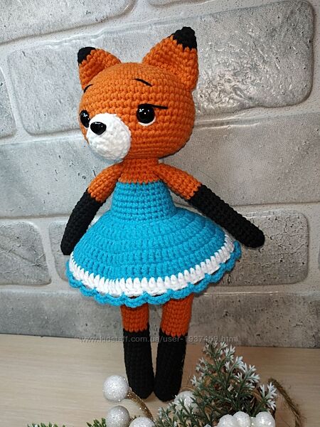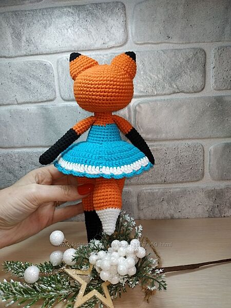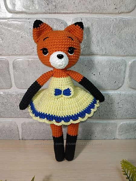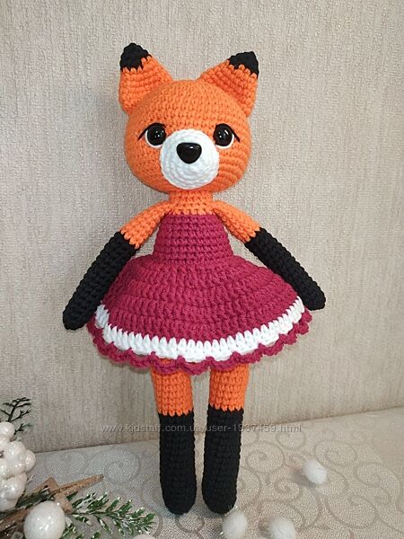 Довгонога лисичка в сукні. Зріст 24-25 см. Зв´язана з гіпоалергенної напівбавовни, наповнювач - холлофайбер. Зв´язана щільно, не має просвітів. Очі на безпечному кріпленні. Самостійно не вміє стояти.Рекомендації щодо догляду: ручне прання.