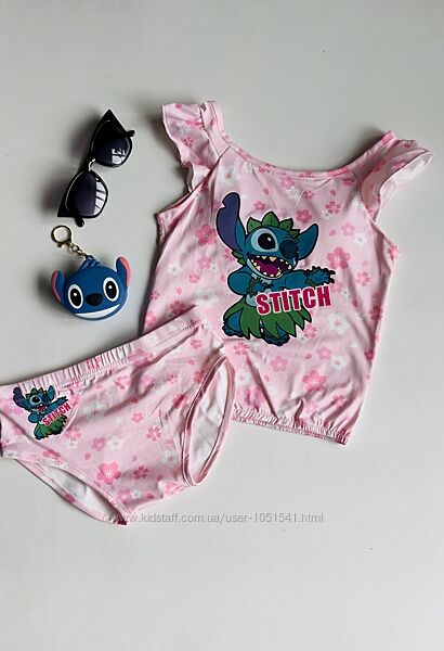 Дитячий роздільний купальник STITCH ,рожевого кольору з зеленим принтомКупальник має майку топ на плечах валанчик підкладку і чашечки , закриту спинку і плавки