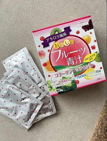 Аодзіру з колагеном та плацентою – унікальний японський БАД для загального оздоровлення та омолодження організму. Він містить колаген. плаценту, вітамін С та 75 видів рослинних ферментів (ензимів), 21 тип овочів, та 20 мільярдів молочнокислих бактерій сприяє зміцненню опорно-рухового апарату, стимулює обмінні процеси, підвищує кровообіг, уповільнює старіння. Завдяки величезній кількості вітамінів і мінералів він стимулює імунітет, покращує здоров´я та вигляд шкіри, зменшує зморшки та зміцненює структуру шкіри, зміцненює волосся, нігті та хрящі, підвищує рівень енергії та знижує рівень стресу. Ще одна особливість засобу – приємний смак ацероли, що сподобається кожному.