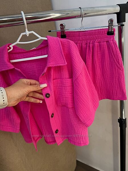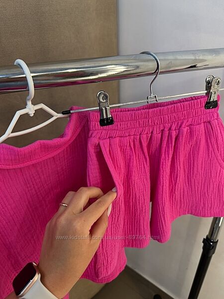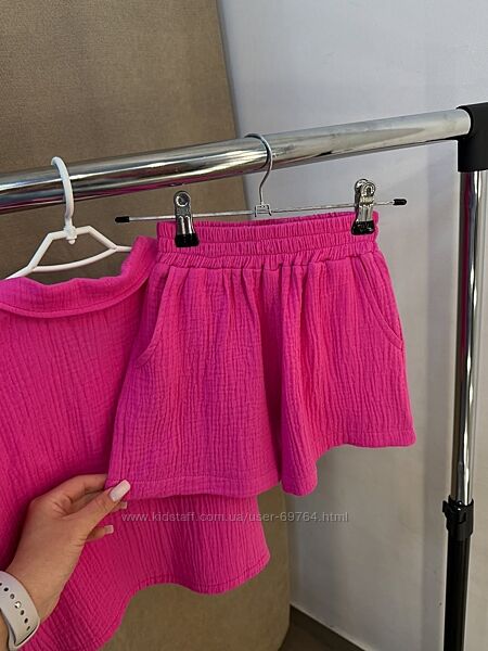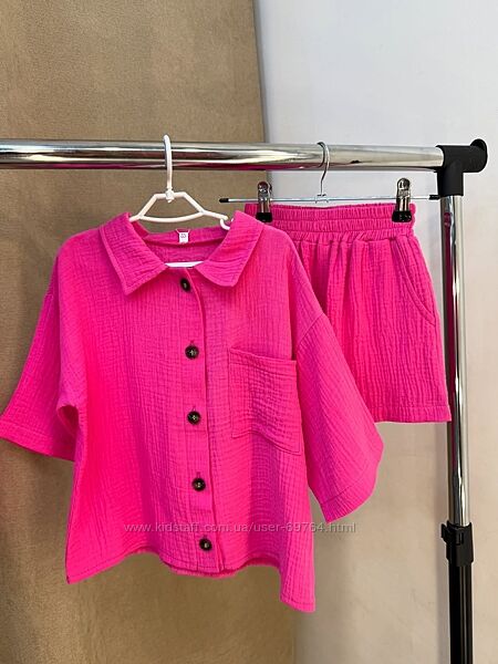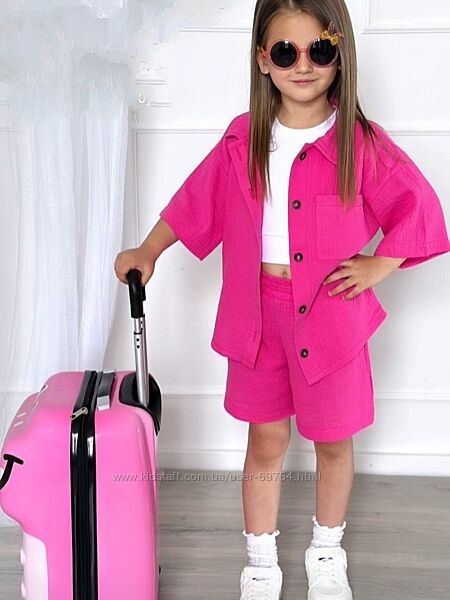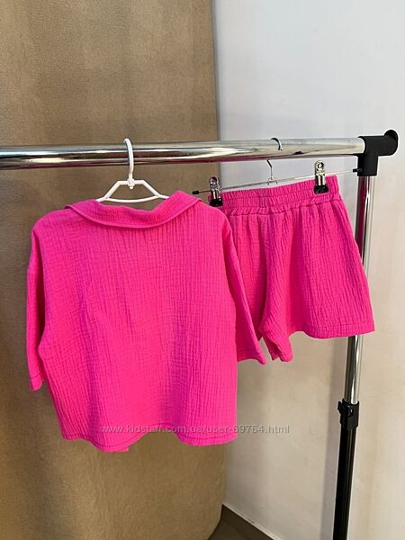 Летний комплект из муслина, рубашка и шорты для девочки.Муслин (легкая натуральная дышащая ткань 100% хлопок)