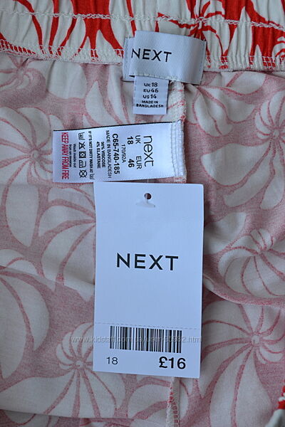 Літні шорти Next з м´якого, приємного до тіла віскозного трикотажу. завжди зручні, мають добрий вигляд, не мнуться. На бирці 18 розмір, меніздається, що гарноі на 16, вільними, орієнтуйтеся за вимірами. Є дві