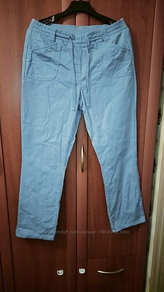 Трендові котонові штани у спортивному стилі від Cotton Traders. Колір ближче до бузкового з відтінком. 100% котон. Пояс на резинці по спинці. Спереду на зав´язках. Бокові кішені. Посадка середня. Брюки в ідеальному не ношеному стані. Розмір L-XL. Орієнтуйтесь по замірах!Н/о пояс - 40/приблизно 48-49 у розтягнутому стані
