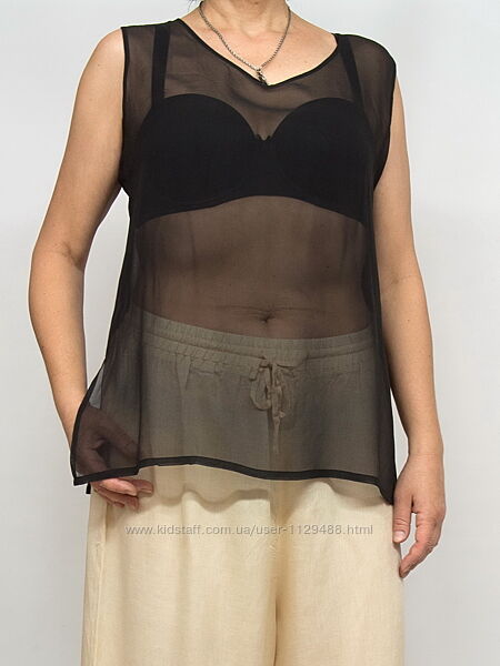 черный: по груди 56 см, по талии 59 см, по бедрам 59 см, длина 66 см, пройма 23 см, плечо 8 см