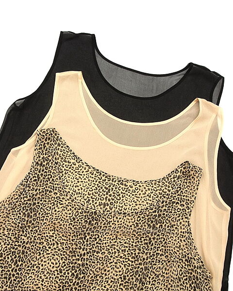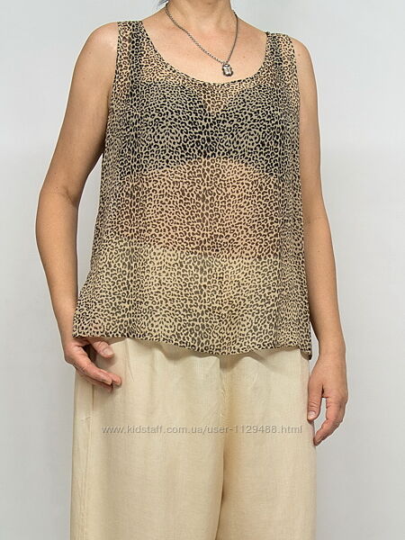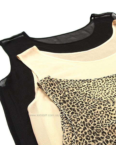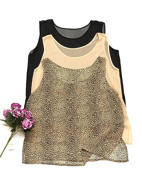 Очень интересный комплект--можно носить как по отдельности, так и друг на друга, сочетая как угодно, хоть по два, хоть все три сразу. Крой свободный, внизу по бокам небольшие разрезы. Одинаковые, различается только ширина плеча--самое широкое у черного, самое узкое у леопардового. Выполнены из легкого шероховатого полупрозрачного натурального шелка, очень приятные к телу, не жаркие, дышащие.
