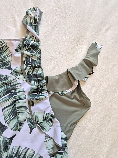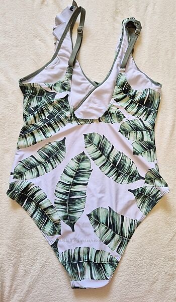 Жіночий літній пляжний суцільний купальник shine ХXL , маломірить і підійде на 48-50 розмір з контрастними деталями в принт листя,, ліф вставні чашки, перед на підкладці, відкрита спина та регульовані бретеліНОВИЙ, розмір XL, ціна заявлена кінцева