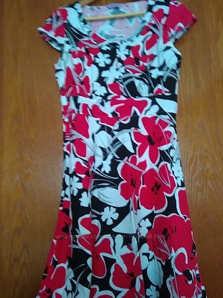 Пропоную літню жіночу сукню, європейський розмір 12 (наш 44-46), в яскравий квітковий принт.Сукня з широкою спідницею, з рукавчикамии напівкрильцями, Приблизно під грудями вшитий пояс - полоска тієї ж тканини, що і сама сукня, шириною 5 см. Від горловини вертикально вшиті 4 фальш-гудзики.