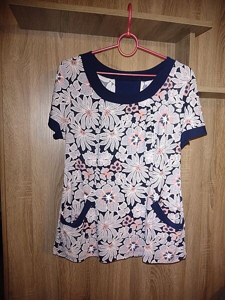 Блуза блузка кофта женская летняя трикотажная. Размер 48 - 50, цвет тёмно - синий с белым "цветочным принтом". Силуэт прямой, прилегающий к фигуре; с коротким рукавом, двумя карманами, круглым вырезом горловины. Сзади - имитация декоративной застёжки. Материал - мягкий эластичный трикотаж, приятный на ощупь: хорошо растягивается и красиво облегает.Длина 67см, окружность груди 102см, окружность бёдер 110см, длина рукава 20см.