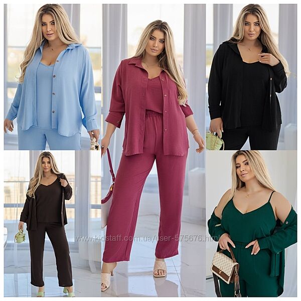 Жіночий та елегантний костюм-трійка з американського крепу – ідеальний вибір для сучасної леді. Комплект складається з вільних штанів, топа з глибоким V-подібним вирізом та легкої сорочки, створюючи вишуканий образ з ноткою розслабленої елегантності. Насичені кольори надають благородства, а фактура тканини підкреслює витонченість стилю. Відмінно поєднується з босоніжками та міні-сумкою – як на фото – для завершеного та модного образу.
