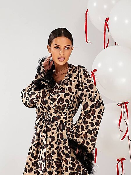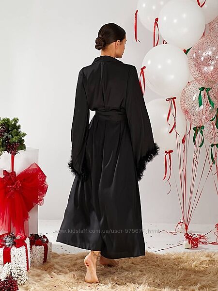 Роскошный шелковый халат с черным мехам на рукавах. Легкий и приятный на ощупь материал обеспечивает комфорт, а пояс помогает подчеркнуть фигуру. Глубокий вырез и высокий разрез добавляют образу нотки элегантности и чувственности