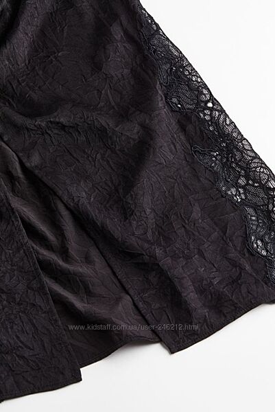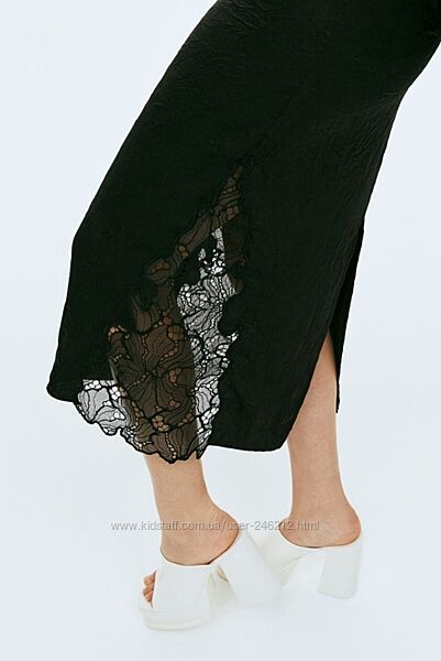 Елегантна фактурна спідничка H&M з мереживомПриталена спідниця довжиною до литок із тканого фактурного матеріалу з мереживними вставками з боків.
