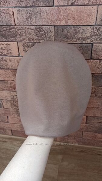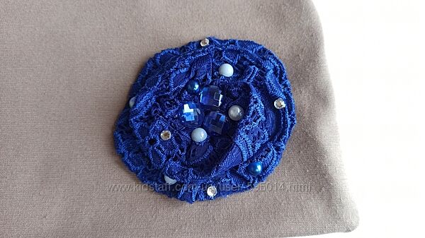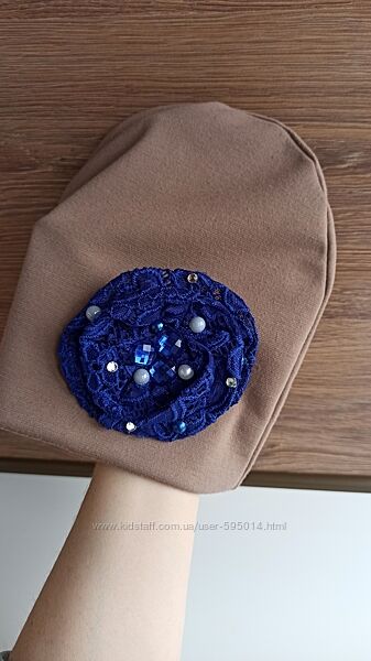 Шапка цвет капучино с синим кружевным цветком в бусинах и камушках. Двойная.