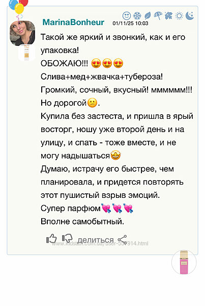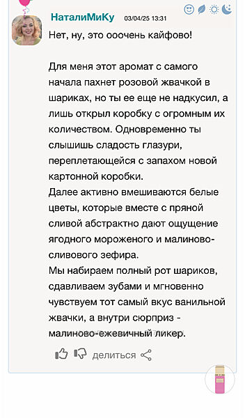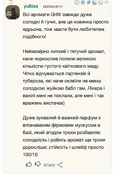 Зацукровані різнотравʼя, де відчутно квітковий мед, а потім слива з кісточкою, потім темний лікер як в Dior Hypnotic Poison. Багатогранний та складний аромат, який залише незабутні враження. Гучний та стійкий як всі Грітті.