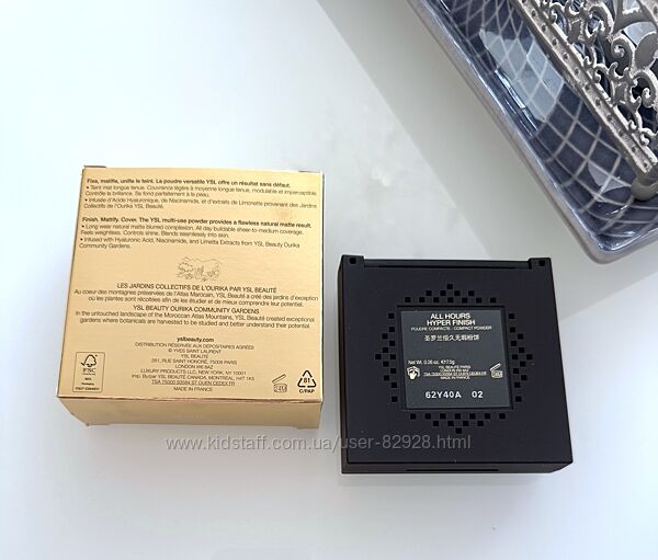 Опис: Це нова багатофункціональна матова пудра від Yves Saint Laurent. Матує та фіксує макіяж до 24 годин. Наповнена активними компонентами для догляду за шкірою та складається на 90% з інгредієнтів натурального походження. All Hours Hyper Finish розмиває недосконалості та мінімізує видимість пор, одночасно розгладжуючи шкіру. Завдяки гіалуроновій кислоті, ніацинаміду та ліметті з YSL Beauty Ourika Community Garden, ця формула залишає шкіру комфортною та гладкою, не висушуючи її. Завдяки своїй дрібно подрібненій текстурі, що добре розтушовується та дихає, Hyper Finish забезпечує бездоганне нанесення, незалежно від того, чи наноситься вона на тональний крем як фіксуюча пудра, чи рівномірно наноситься на шкіру як сама пудра. Ця надзвичайно універсальна матова пудра ідеально підходить для: фіксації тонального крему на весь день, матування кольору обличчя з м’яким покриттям, самостійного використання для покращення вигляду макіяжу та створення здорового вигляду шкіри. Макіяж фіксується, і він ніколи не здається липким або жирним