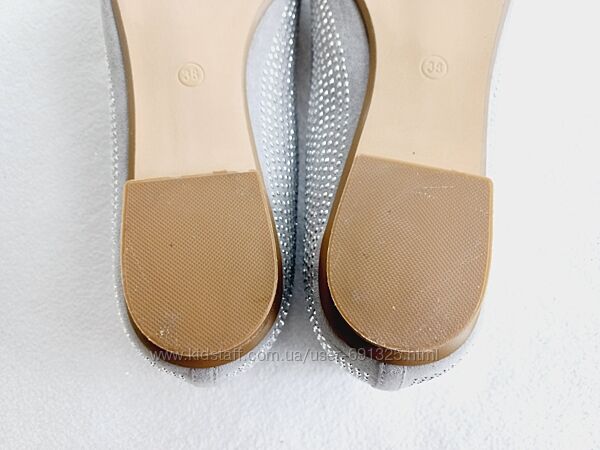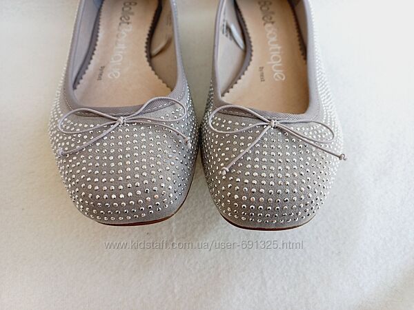Пропоную сірі балетки зі стразами, від Next. Матеріал текстиль під замшу. Нові, не підійшов розмір.Розмір вказано 5/38. Довжина устілки всередині 24,5 см, ширина 8 см.