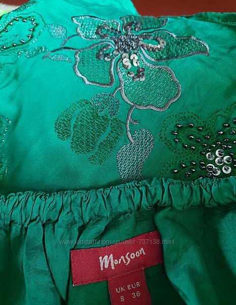 • Шовковий топ - бренд Monsoon, розмір S. Гарний візерунок, оздоблений бісером, паєтками. Сбоку застібається на молнію. Колір смарагдово-зелений. Підійде під спідницю чи шортики. Ціна 20 грн.