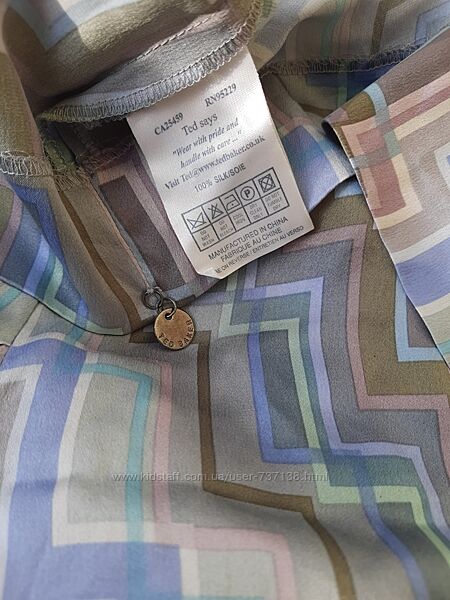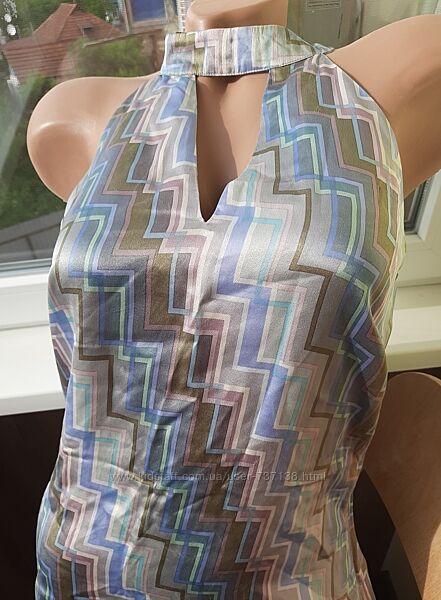 • Шовковий топ - бренд TED BAKER, розмір M. (Манекен розмір S, тому трохи вільно сидить). Сріблясто-блакитний колір, сучасний динамічний принт. Сбоку також застібка - молнія. В шовку зовсім не відчуваєш жару. Ціна - 20 грн.