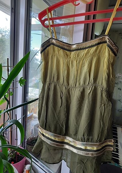 • Ще один шовковий топ, відомий бренд KAREN MILLEN, градієнт кольорів, паєтки, стрічки - яскраво, привабливо. На бретельках. Внизу застібається на гудзики. Розмір S, XS. ПОГ 39 см, там паєтки, не тягнеться. Далі резинка - тягнеться, внизу півобхват 45 см. Довжина з бретельками 66 см. Ціна 25 грн.