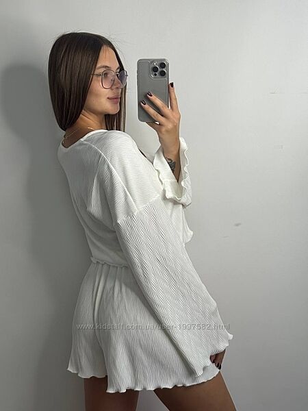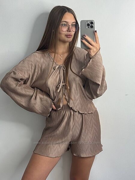 Кофточка з довгим рукавом, вхідного крою на зав´язках і вільні шортики, пояс на резинці.