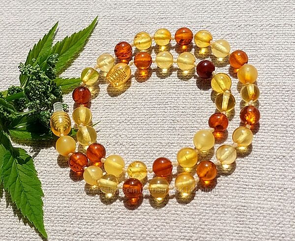 Дитячі янтарні буси виготовлені з натурального цільного бурштину, що відомий своїми лікувальними властивостями.Намисто складають маленькі бусини-кульки в гарному поєднанні прозорих золотистих та коньячно-вишневих відтінків. Намистини зібрані на міцній вощеній нитці через вузлики, що запобігає їх перетиранню.