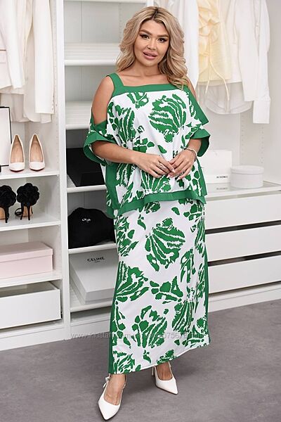 Стильний літній костюм, що складається з блузи та спідниці. Комплект виконаний з легкої тканини з абстрактним принтом, що нагадує великі квіткові чи тропічні мотиви.