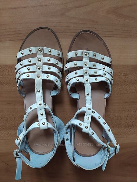 Босоножки бежевые кожаные фирмы Dune,застёжка на 2 замочка,каблук устойчивый 6×4см,высота каблука-4,5-5см.Фурнитура золотистого цвета.Набойка целая.
