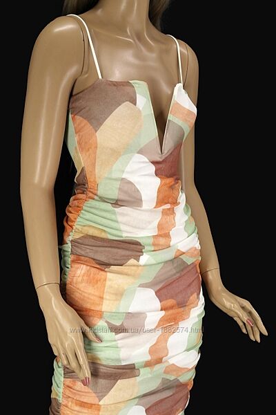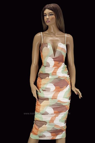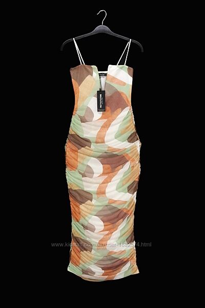Новое брендовое облегающее платье миди "PrettyLittleThing" с абстрактным принтом. Размер uk8/eur36.Без застёжки, V-образный вырез на косточках, со сборками по бокам, на тонких бретельках, из эластичной сеточки на подкладке.