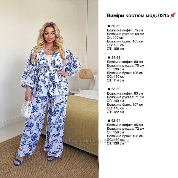 Верх має V-подібний виріз і фіксується на талії за допомогою куліски, що дозволяє регулювати об’єм і красиво підкреслює силует. Рукави об’ємні, з м’якими зборами на манжетах, додають легкості образу. Штани — широкі, вільного крою, що забезпечує комфорт і свободу рухів.