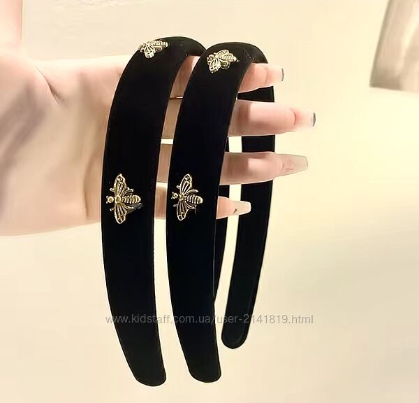Элегантный черный обруч из мягкого бархата, украшенный золотыми пчелками - модный и стильный аксессуар для ваших образов. Бархат придает изделию роскошный вид, а миниатюрные пчелки добавляют утонченности и шарма. Смотрится очень благородно и напоминает стиль известных брендов.Цвет: черный бархат, пчелки золотые