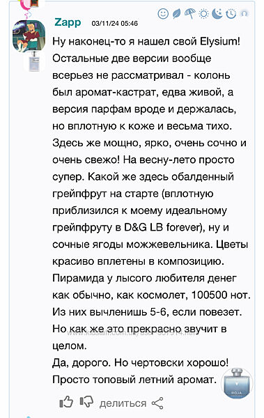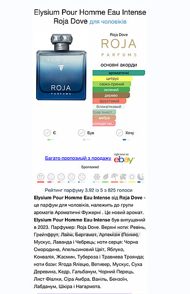 Roja Parfums Elysium Eau Intense - 115 грн/1 млОдин з кращих ароматів 2023 року. Це прогулянка вздовж морського узбережжя, де свіже прохолодне повітря освіжає після спекотного дня. Шипучий терпкий ревінь, ягоди ялівцю, грейпфрута та мускуса - все на початку обʼєднаналось для втілення елегантності та чоловічої мужності. Розкішна деревно-землиста та ветиверна база.