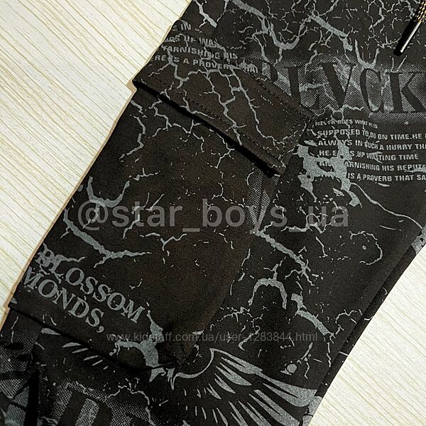 Дуже круті, стильні та красиві спортивні джогери для хлопців. Люкс якість. Тканина двунитка. Пояс-гумка зі шнурком, низ-манжет. Наявність кишень на молнії. Принт відмінної якості. Країна-виробник Угорщина. Фірма Grace. Склад 95% бавовна, 5% поліестер. Колір чорний.В наявності: