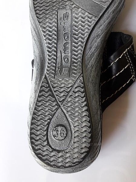 Tamaris нові м´які ілегкі повністю шкіряні босоніжки шльопанці 36 р. Взуття на нозі невагоме. Ззовні та всередині шкіра м´яка, як на рукавицях. Уся внутішнядовжина 24 см, ширина устілки 8, 2 см. Висота танкетки 4 см, спереду 2, 5 см.