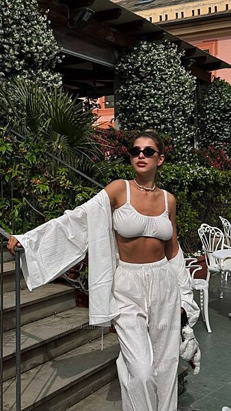 Інші брючні костюми нашого магазину Ви можете переглянути за посиланням: https://www.kidstaff.com.ua/user-anno-1997582/sect...Легкий льняний костюм-трійка: вільна сорочка з широкими рукавами, топ із зібраною гумкою та штани прямого крою з високою посадкою. Ідеальний варіант для спекотних днів і стильних мандрівок. Комфорт, свобода рухів — усе в одному образі