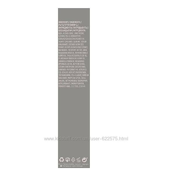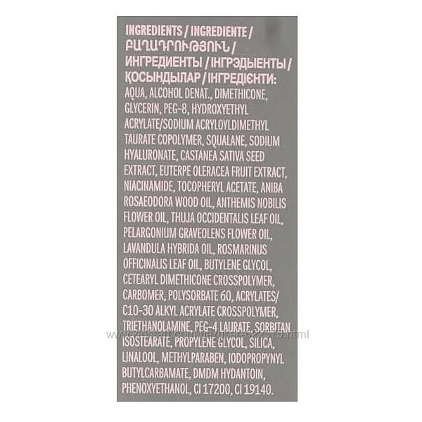 Список інгредієнтів: AQUA,ALCOHOL DENAT,DIMETHICONE,GLYCERIN,PEG-8,HYDROXYETHYL ACRYLATE/SODIUM ACRYLOYLDIMETHYL TAURATE COPOLYMER,SQUALANE,SODIUM HYALURONATE,CASTANEA SATIVA SEED EXTRACT,EUTERPE OLERACEA FRUIT EXTRACT,NIACINAMIDE,TOCOPHERYL ACETATE,ANIBA ROSAEODORA WOOD OIL,ANTHEMIS NOBILIS FLOWER OIL,THUJA OCCIDENTALIS LEAF OIL,PELARGONIUM GRAVEOLENS FLOWER OIL,LAVANDULA HYBRIDA OIL,ROSMARINUS OFFICINALIS LEAF OIL,BUTYLENE GLYCOL,CETEARYL DIMETHICONE CROSSPOLYMER,CARBOMER,POLYSORBATE 60,ACRYLATES/C10-30 ALKYL ACRYLATE CROSSPOLYMER,TRIETHANOLAMINE,PEG-4 LAURATE,SORBITAN ISOSTEARATE,PROPYLENE GLYCOL,SILICA,LINALOOL,METHYLPARABEN,IODOPROPYNYL BUTYLCARBAMATE,DMDM HYDANTOIN,PHENOXYETHANOL,CI 17200,CI 19140
