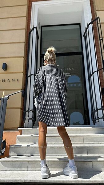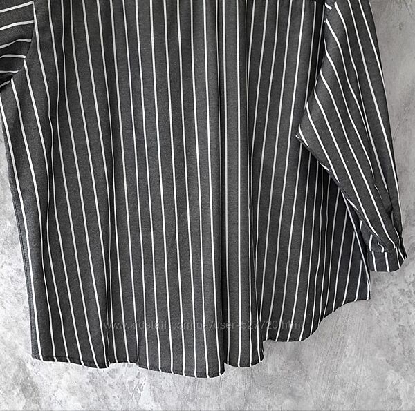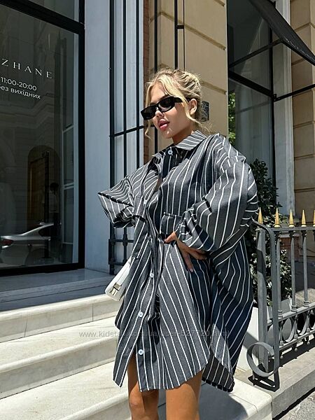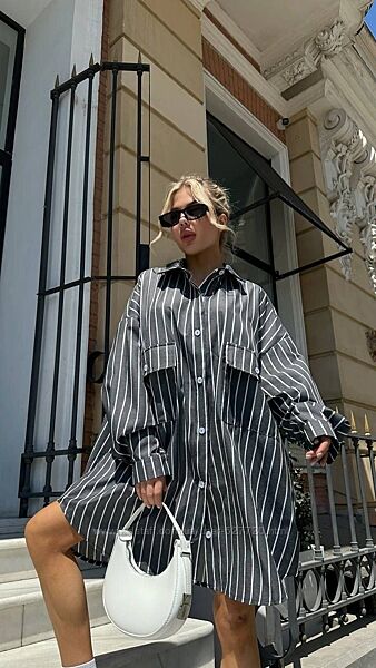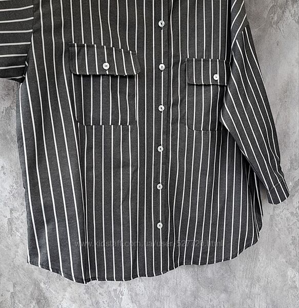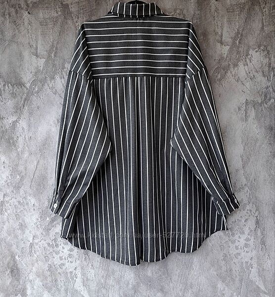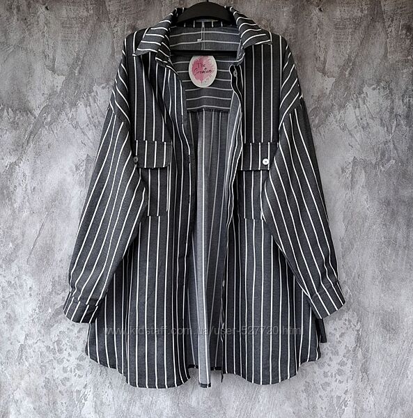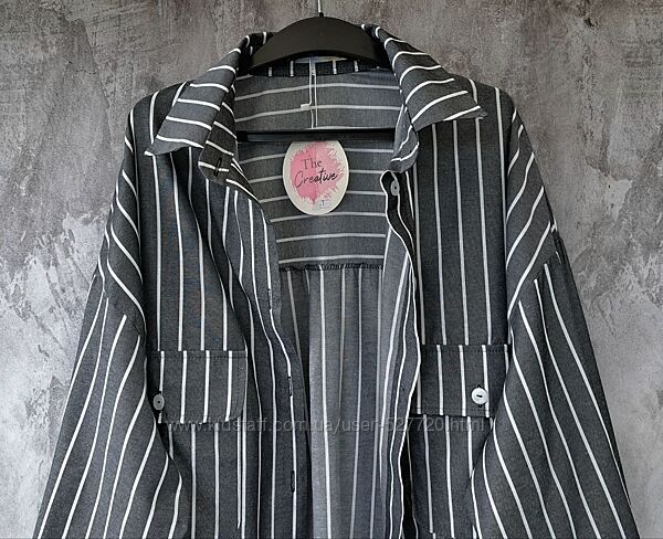 Жіноча довга сорочка в смужку. Модель у стилі оверсайз прямого широкого крою з відкладним коміром, спереду по всій довжині застібається на гудзики, на грудях накладні кишені з планкою на гудзику. Плечовий шов приспущений, довгий рукав знизу зі складками на манжетах з ґудзиком. Спинка з кокеткою та внутрішньою складкою, з боків злегка округлі розрізи.Країна-виробник: Україна