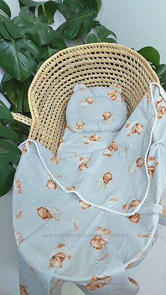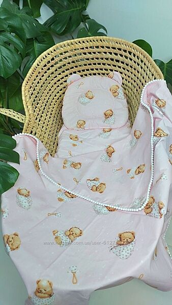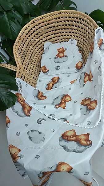 Набір у візок з польської бавовни (непромокаюча простинка+ плед+ плоска подушка). Для теплого літнього періоду Заміри: Пледик з двох шарів бавовняної ткани -99/79 см Простинка непромокаюча-91/50 см Подушка плоска ведмедик-29/23 см
