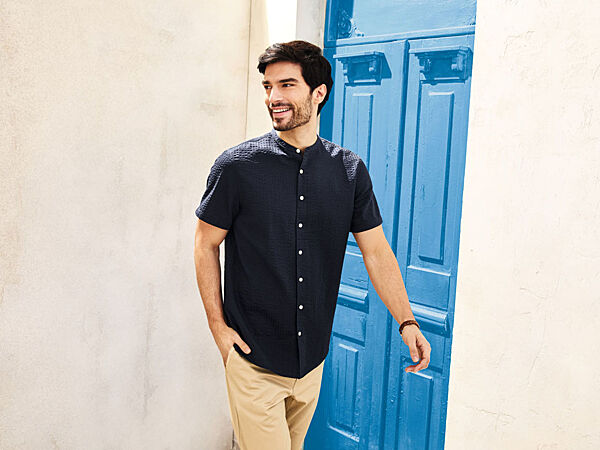Сорочка із коротким рукавом від бренду Livergy. Приємна до тіла завдяки високому вмісту бавовни. Злегка розкльошений крій із заокругленим низом. З коміром-стійкою.Заміри: надаємо по запиту
