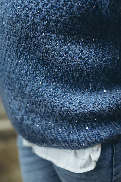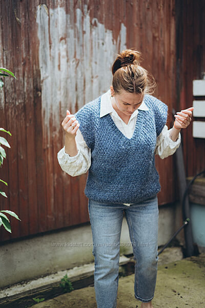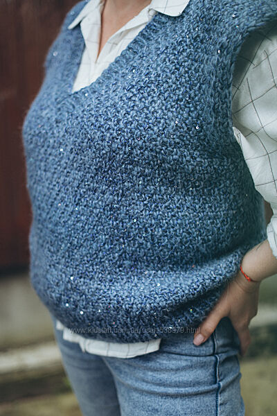 В наявност! Жилетка з паєткою, в кольорі джинса. Головна ниточка Drops Air + ниточка кідмохеру + паєтка від Lanoso, все це створює меланжевий відтінок з перепадами тонів. Розмір С /Л: Ширина 54 см. Довжина 57 см.