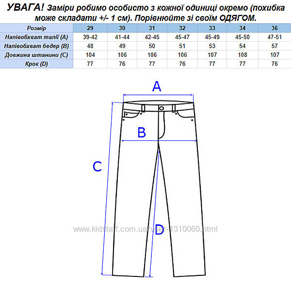 Размер W (в дюймах) | 29, 30, 31, 32, 33, 34, 35 |