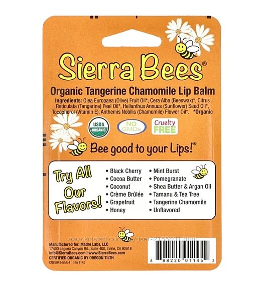 Sierra Bees Органический бальзам для губ с ромашкой и мандариномСодержит добытый из возобновляемых источников пчелиный воск, оливковое масло, подсолнечное масло и витамин Е