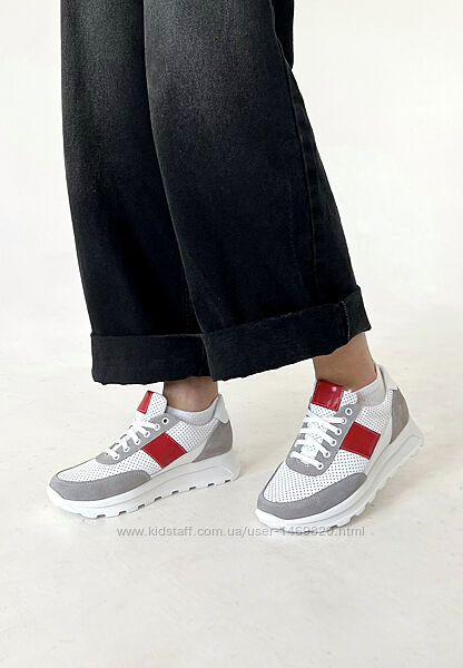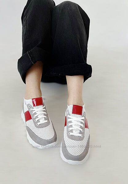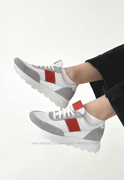 Летние кроссовки кожаные с перфорацией цветные, разноцветные женские.Верх: натуральная кожа ( белый и красный цвет) и натуральная замша (серый цвет).
