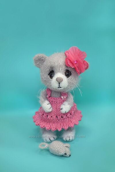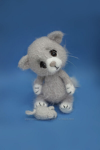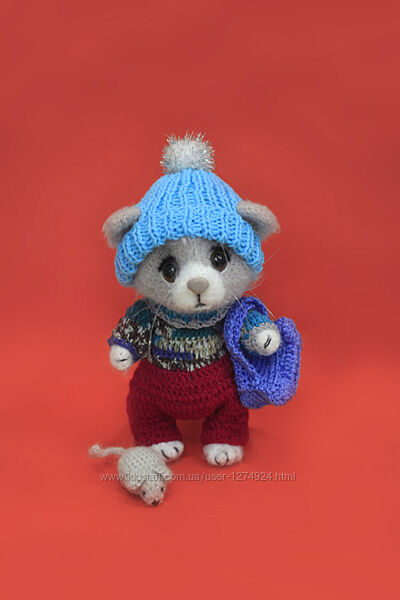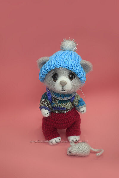 Котик с мышонком в одежках связан крючком из пушистой акриловой пряжи. Размер 21 и 6 см. Внутри каркас из медной проволоки, все части теласгибаются. Одежда снимается. Подарочная упаковка, ручная работа.