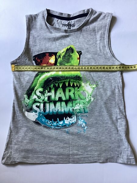 Літня майка для любителів акул, бавовна 100%, заміри на фото. З акулами H&M, розмір 6-8/122-128, вартість-45 гривень; з пащею акули TRN, розмір 6-7/116-122, вартість 55 гривень; дивіться інші мої оголошення, запитуйте, що саме вас цікавить.