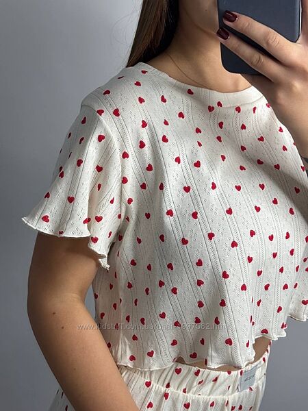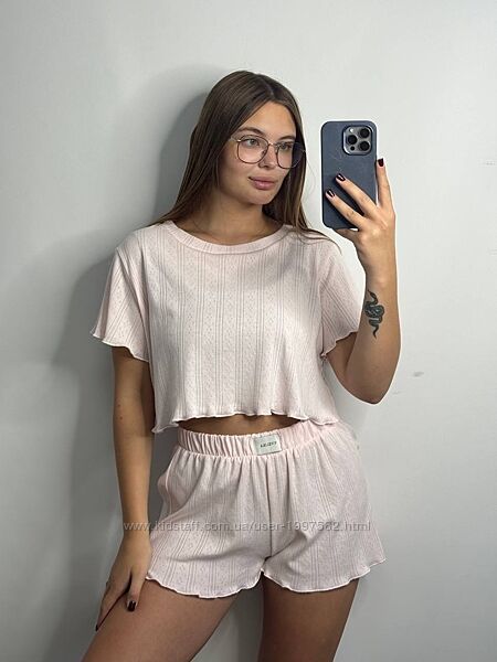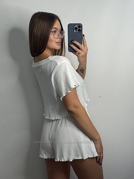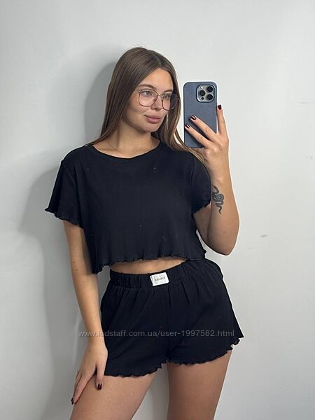 Легкий костюм для дому у трикотажній тканині. Футболка має укорочений з обр